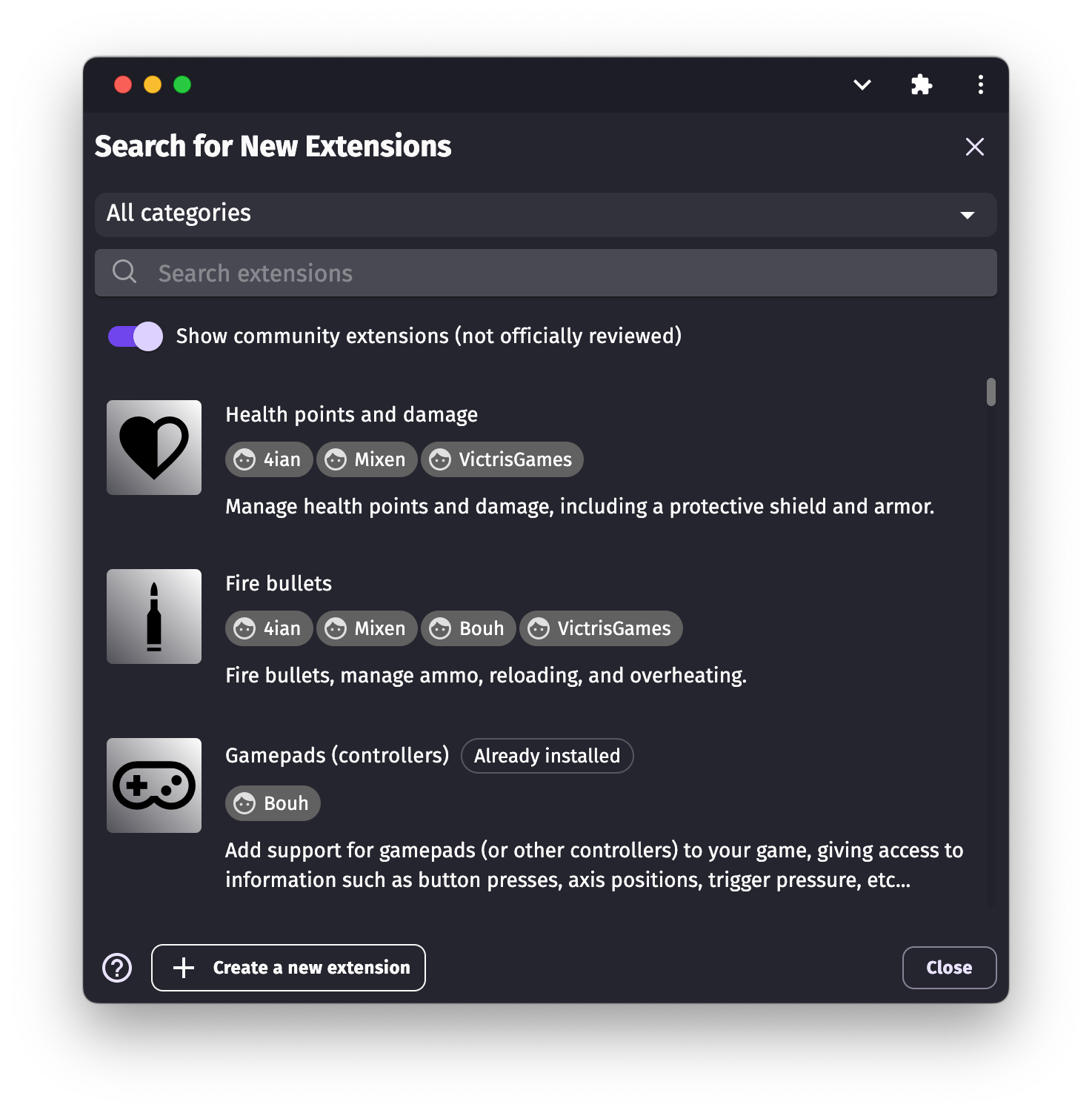 All the extensions from the GDevelop ecosystem will be shown: