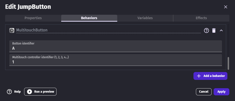 The multitouch button behavior allows the developer to choose a button name. The same name must also be set in the mapper behavior for the jump.