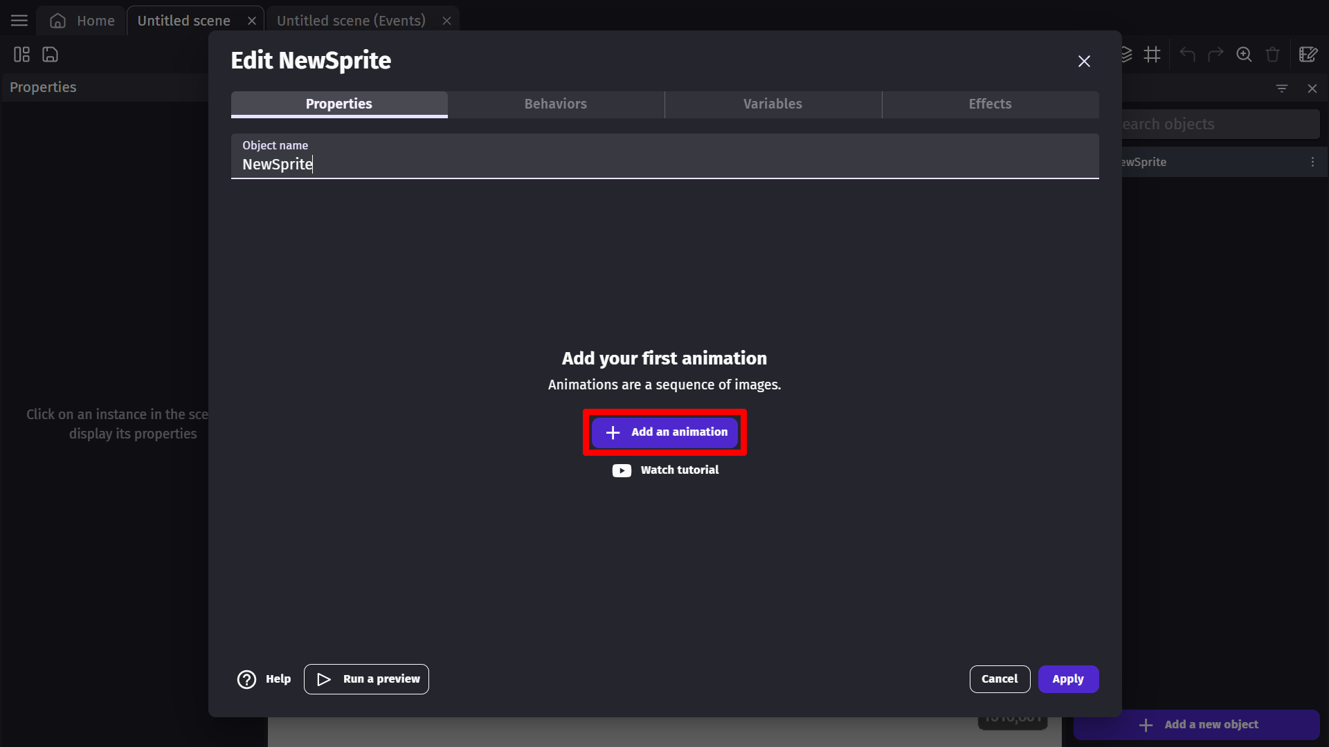 To add a sprite to your scene, select the "Click to add an object" option located on the right at the bottom of the objects panel.