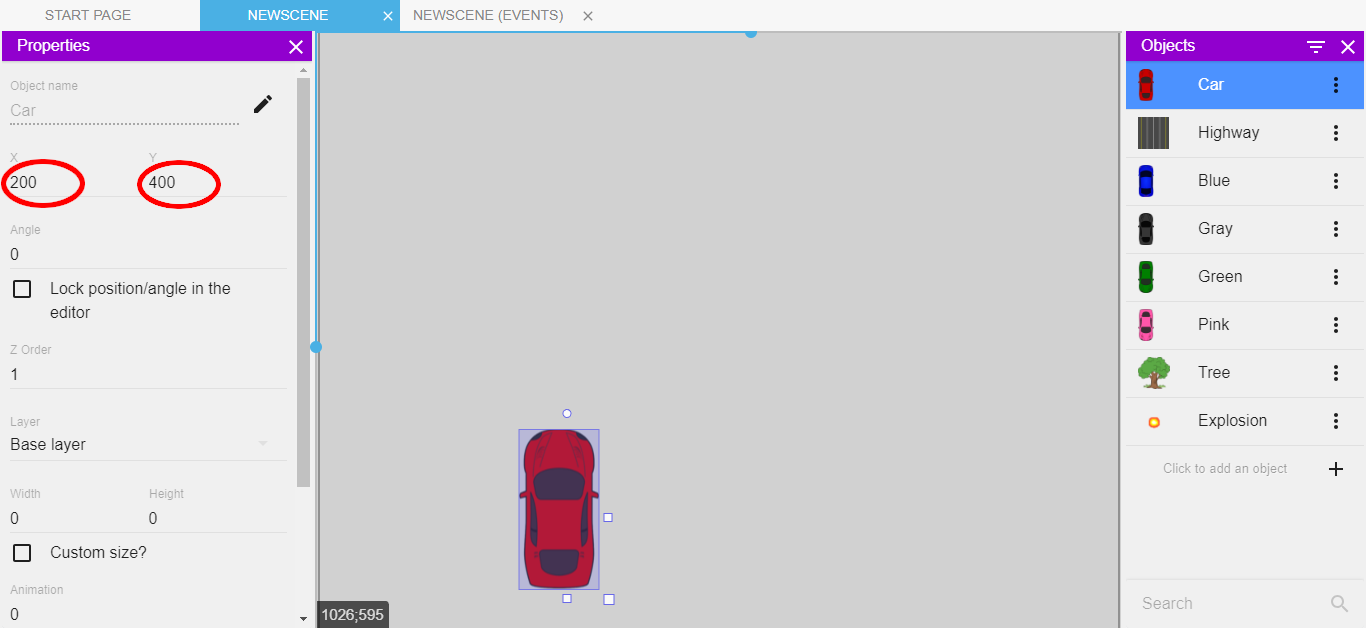 Our first event will include a condition that checks if the X position of the Car is less than 60 px.